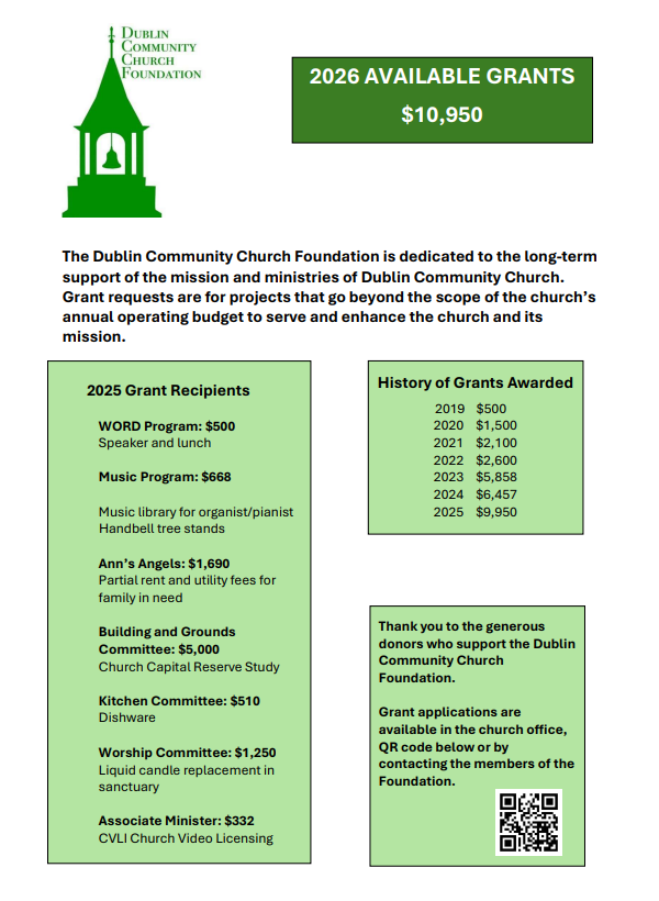 Each spring, the Dublin Community Church Foundation (DCCF) Trustees will announce the annual grant budget for funds for the current year. Grant applications can be requested from the DCC church office and then submitted to the DCC Foundation by members and committees of the church.
